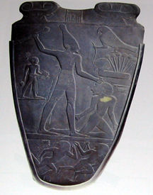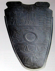 Description: Predynastic. Slate. 25 in. high. Early work that