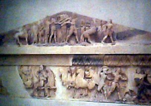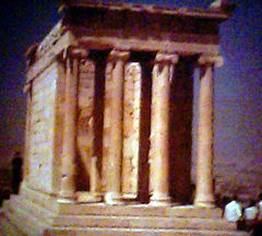 triglyphs. Ionic frieze inside. Columns lean inwards. Fluting